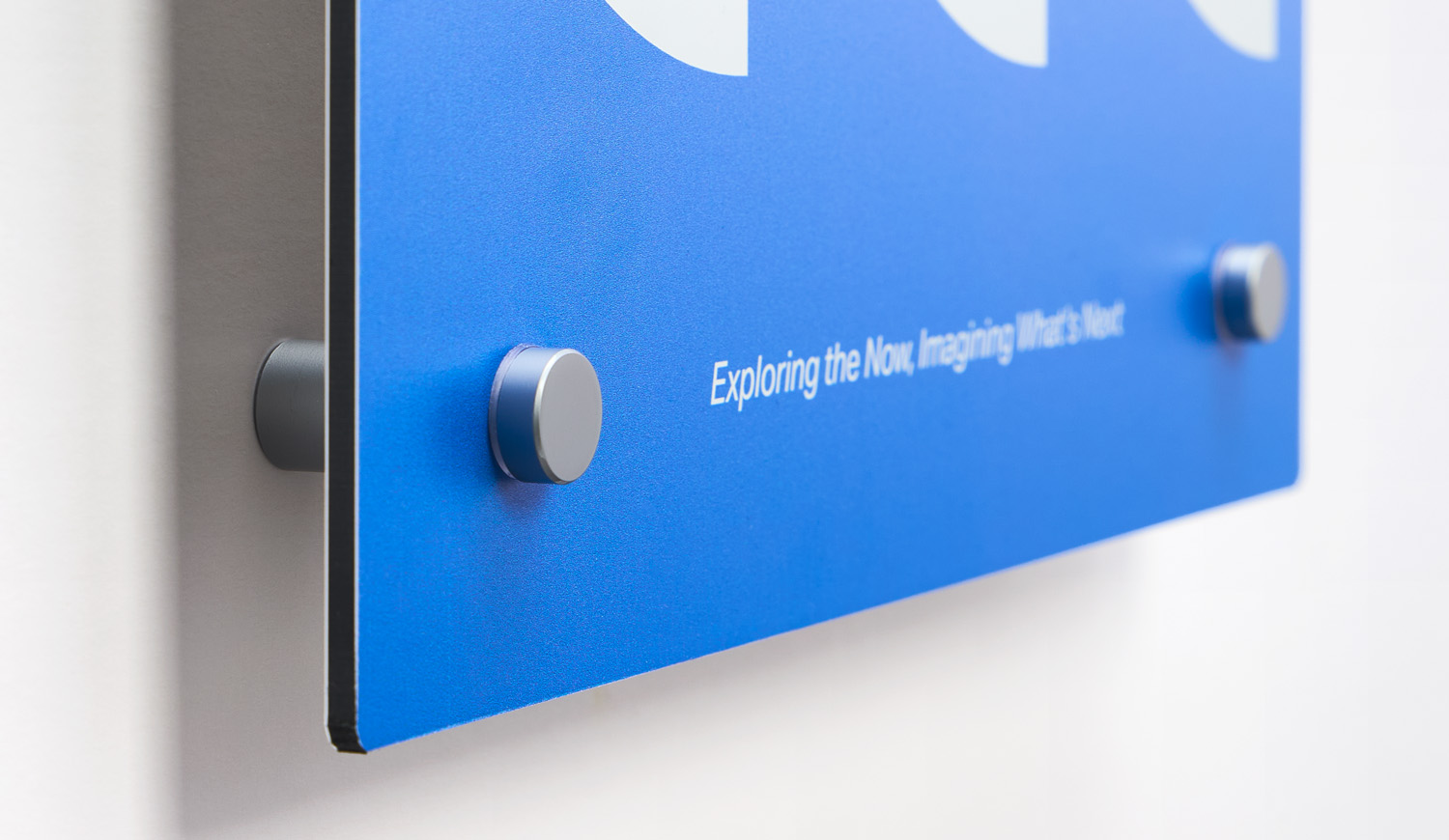 Soms is een teken aan de wand al genoeg om op te vallen. Het bord is verkrijgbaar in verschillende materialen en maten en wordt bevestigd met stalen afstandhouders die het van de muur lichten en het een duidelijke maar lichte uitstraling geven. Een eenvoudig element dat oriënteert, verwelkomt en de omgeving op een natuurlijke wijze karakter geeft.